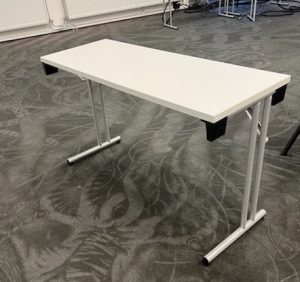 Det er fri tilgang til konferansebord (120×45), stoler og hvite duker. Dette trenger ikke forhåndsbestilles og står plassert på messeområdet.